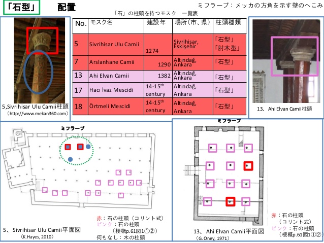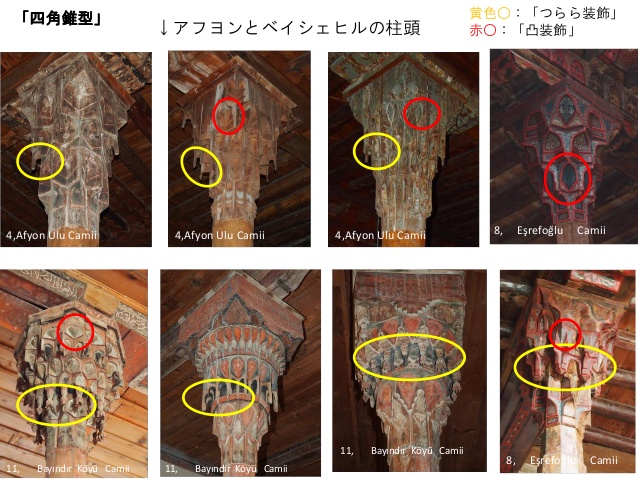 Ana mekân, iri mukarnas başlıklı ahşap ayaklarla kıble duvarına dikey 9 sahna (nef’e) bölünmüştür. Böylece insana sükûnet veren rahat bir mekân etkisi uyandırılmıştır. Cami ye büyük bir manevi hava kazandıran kırk ahşap sütunun tamamı birbirinden farklı başlıklarla tamamlanmaktadır. Bu mukarnas başlıkların biri diğerine benzemeden güzel motiflerle işlenmiştir. Ana mekândaki mukarnas başlıklı bu ağaç sütunlar 5.10 m. boyundadır. Sütunlar vasıtasıyla oluşan neflerden ortadaki nef 5.10 m. genişliği ile diğerlerine göre daha geniş olup, bu yönüyle sütunlar arası normal açıklık kabul edilen 3.70 m/yi aşmıştır.