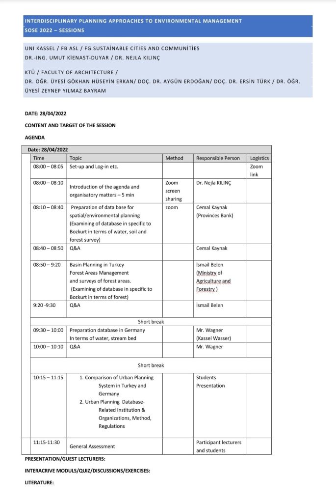 Kassel Üniversitesi ile mezunu olduğum Karadeniz Teknik Üniversitesinin Mimarlık Fakültesi Şehir ve Bölge Planlama Bölümü işbirliğinde dönem semineri olarak “”Çevre yönetimine disiplinler arası planlama yaklaşımları-Interdisciplinary planning approaches to environmental management” dersi veriliyor.